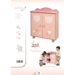 Comprend : 1 armoire en bois pour poupées, sérigraphiée avec design spécial de la gamme Tulipe de couleur rose, deux portes fonctionnelles, trois cintres en bois et bien plus de détails de luxe.