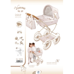 Le pack comprend : Poussette de poupées de couleur blanche et beige avec imprimé spécial de la gamme Verona, structure pliable, plateau inférieur porte-objets, grandes roues de style classique recouvertes de caoutchouc silencieux, poignée rembourrée, nacelle rigide, capote avec tendeurs, sac assorti pour la poussette et plus de détails de luxe.