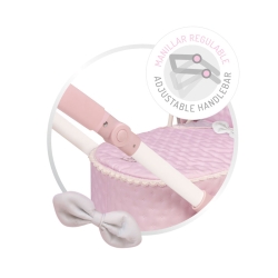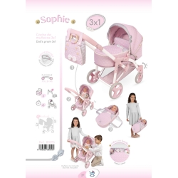 Comprend : 1 poussette de poupées 3 en 1 de la gamme Sophie de couleur rose avec des détails blancs et gris, convertible en poussette de promenade ou nacelle porte bébés avec structure pliable, poignée avec hauteur réglable, roues avant rotatives, tissu renforcé, rubans, détails brodés, boutons décoratifs en bois naturel, roues avec revêtement de mousse, couvre nacelle avec petite poche, sac assorti avec anses en bois naturel, plateau porte objets en tissu assorti.