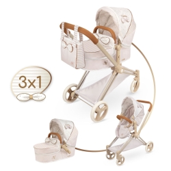 Comprend : 1 poussette de poupées Verona de couleur beige avec design 3 en 1 transformable en poussette de promenade et en nacelle, structure pliable, roues avant rotatives, ceinture de sécurité style harnais, plateau inférieur porte objets, tissu renforcé avec des détails géniaux, couvre nacelle avec rubans, sac assorti et plus de détails de luxe.